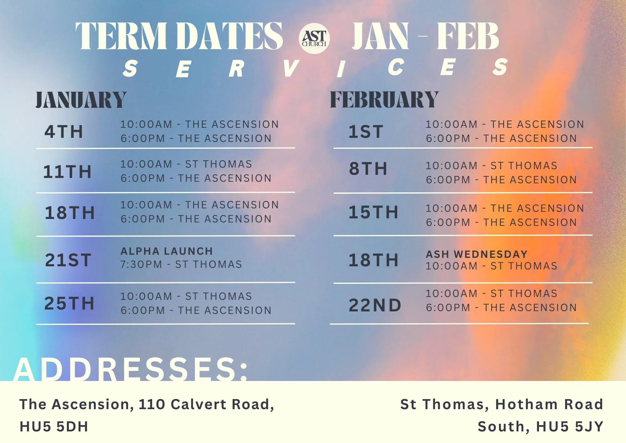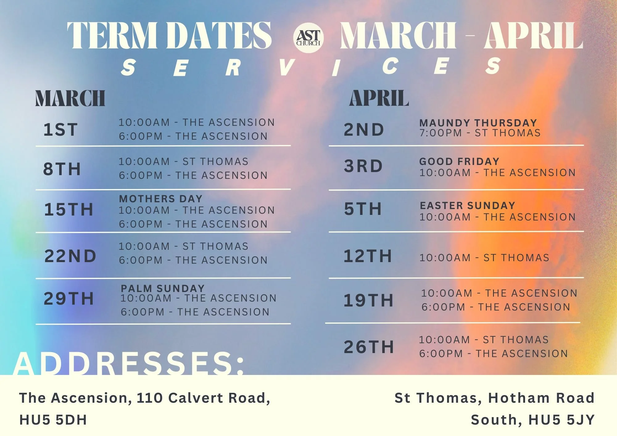 The 10am Communion Service alternates each week between The Ascension and St Thomas’. This service is friendly and welcoming with an informal style of liturgical worship that includes Bible teaching and traditional and contemporary musical worship. Families are really welcome at AST; we have a children’s space at both churches and are working towards more provision for children. We also build relationships at the end over a cuppa. The service lasts for approximately 1 hour and 15 minutes.